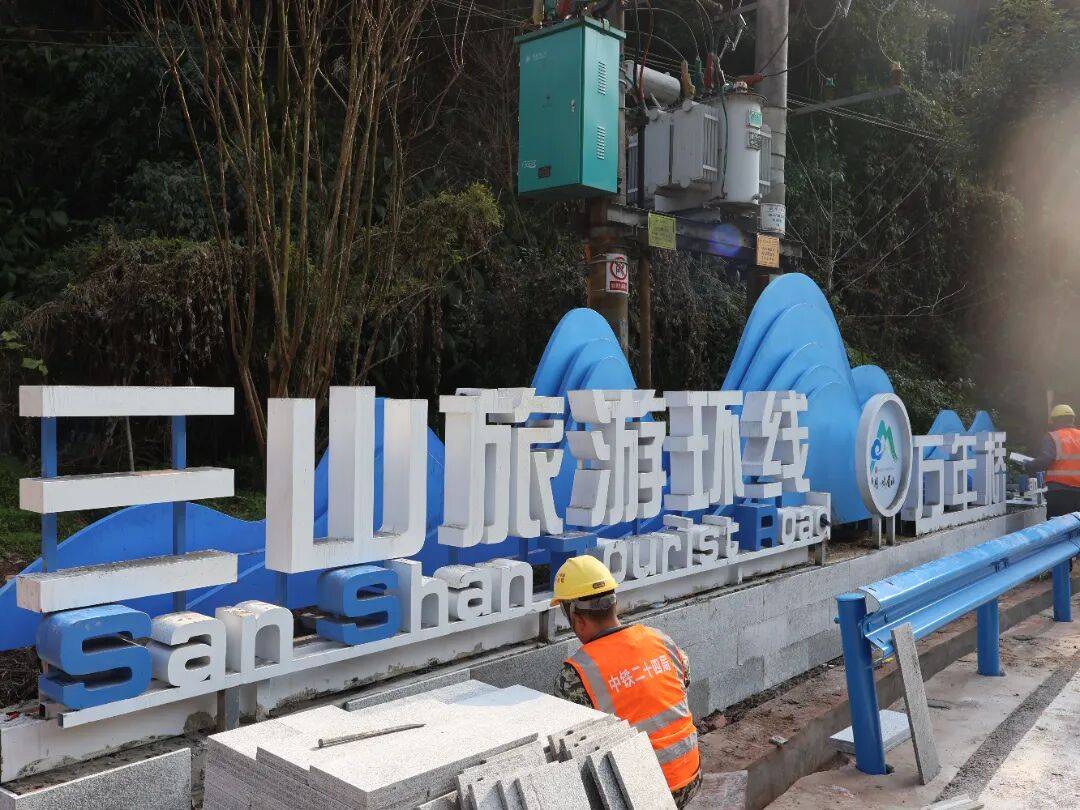 项目已完成全线公路病害集中治理,防撞护栏新建与原有波形护栏更新工作有序推进,易塌方路段防护网铺设、开裂墙面加固等安全保障工程同步落实,有效消除了一批道路安全风险点;交安设施与信息管理设施建设稳步推进,全线部分急弯、陡坡路段已完成红蓝双色标识设置,环线起点“峨眉山”标识清晰醒目,单柱式标牌、LED显示屏及装配式管理用房正按计划收尾,为游客便捷安全出行提供坚实支撑。